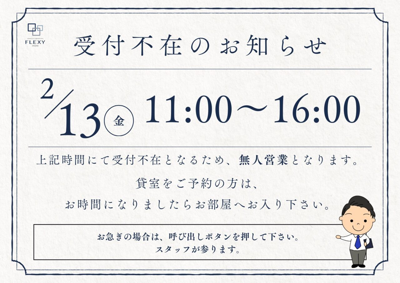 【2月13日(金)11:00~16:00】受付不在のお知らせ